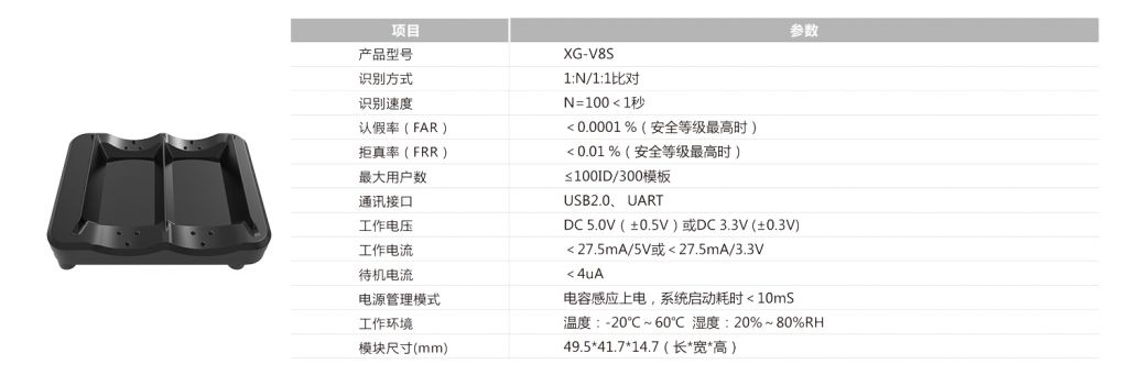 第一代智能鎖模組在市場的推廣普及,指靜脈技術的可靠性得到驗證。在實際應用中,老人小孩、干濕手指、指紋磨損等指紋不能開鎖,指靜脈解決了這部分人群的問題。大家也逐漸認識到,指靜脈鎖和指紋鎖在市場的互補性。智能鎖行業(yè)快速發(fā)展,半導體指紋慢慢替代光學指紋的市場地位。智能鎖除了安全以外,消費者對產(chǎn)品有了更多的追求,更智能、更便捷、更美觀。智能鎖的顏值一度成為鎖企的關注點。2019年,本著以客戶需求為導向的原則,公司推出超薄款全自動鎖XG-V8模組。產(chǎn)品一經(jīng)推出,就受到了市場的廣泛好評,又燃起了更多鎖企對指靜脈鎖市場的信心。同行也開始紛紛效仿推出分體式的指靜脈智能鎖模組,但XG-V8的模組,依然是體積最小,功耗最低的,獨有的兼容指紋協(xié)議,可為鎖企緩解電子方案板分開庫存的壓力。XG-V8模組可兼容共享全自動指紋鎖配件及資源,通用除識別模組以外的其它所有物料。新產(chǎn)品的前期開發(fā),投入少,風險小,產(chǎn)品上線周期短,這樣使鎖企在日益激烈競爭的環(huán)境中,突顯自己的競爭優(yōu)勢。