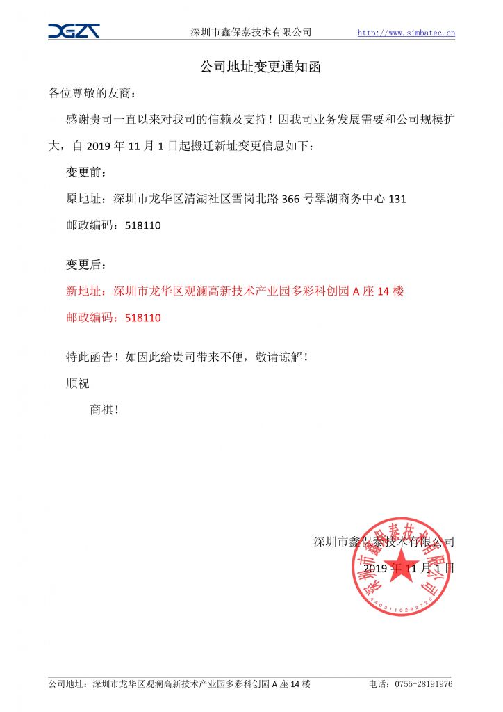 您好!承蒙您長(zhǎng)期以來(lái)對(duì)本公司的大力支持與配合,本公司全體員工表示由衷的感謝!因業(yè)務(wù)發(fā)展需要和公司規(guī)模的擴(kuò)大,自2019年11月1日起,公司將搬遷至新的地址(具體聯(lián)系方式附后),公司地址變更后,原簽訂的合同繼續(xù)有效,原有業(yè)務(wù)關(guān)系和服務(wù)承諾保持不變。我司將以此次搬遷為一個(gè)新的起點(diǎn),進(jìn)一步為您提供更優(yōu)質(zhì)的產(chǎn)品和服務(wù),與您共同發(fā)展!